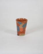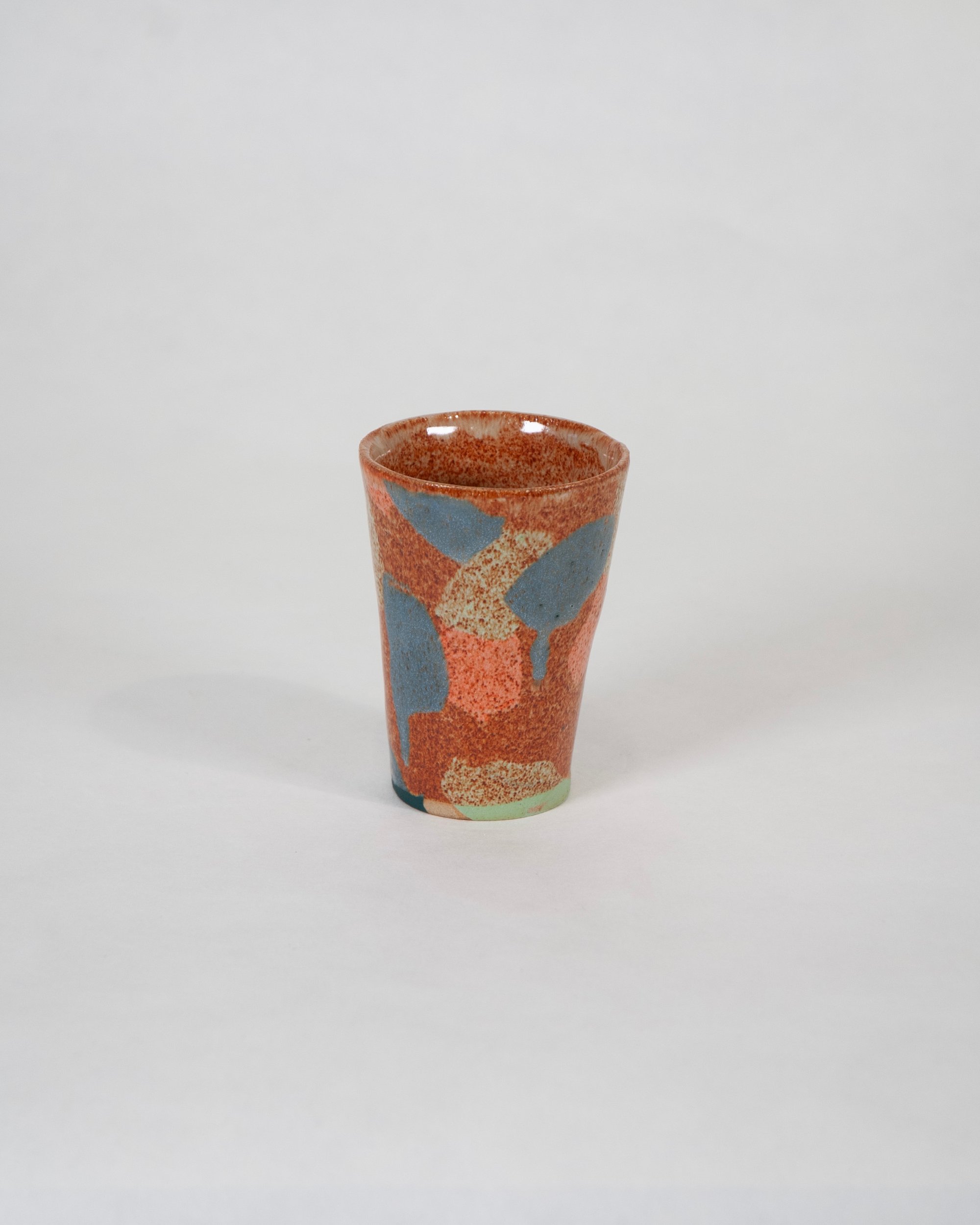 Ceramic stoneware tumbler with a shino glaze and colourful slips. Made by hand at the Common Clay studio in Bexhill-on-sea.