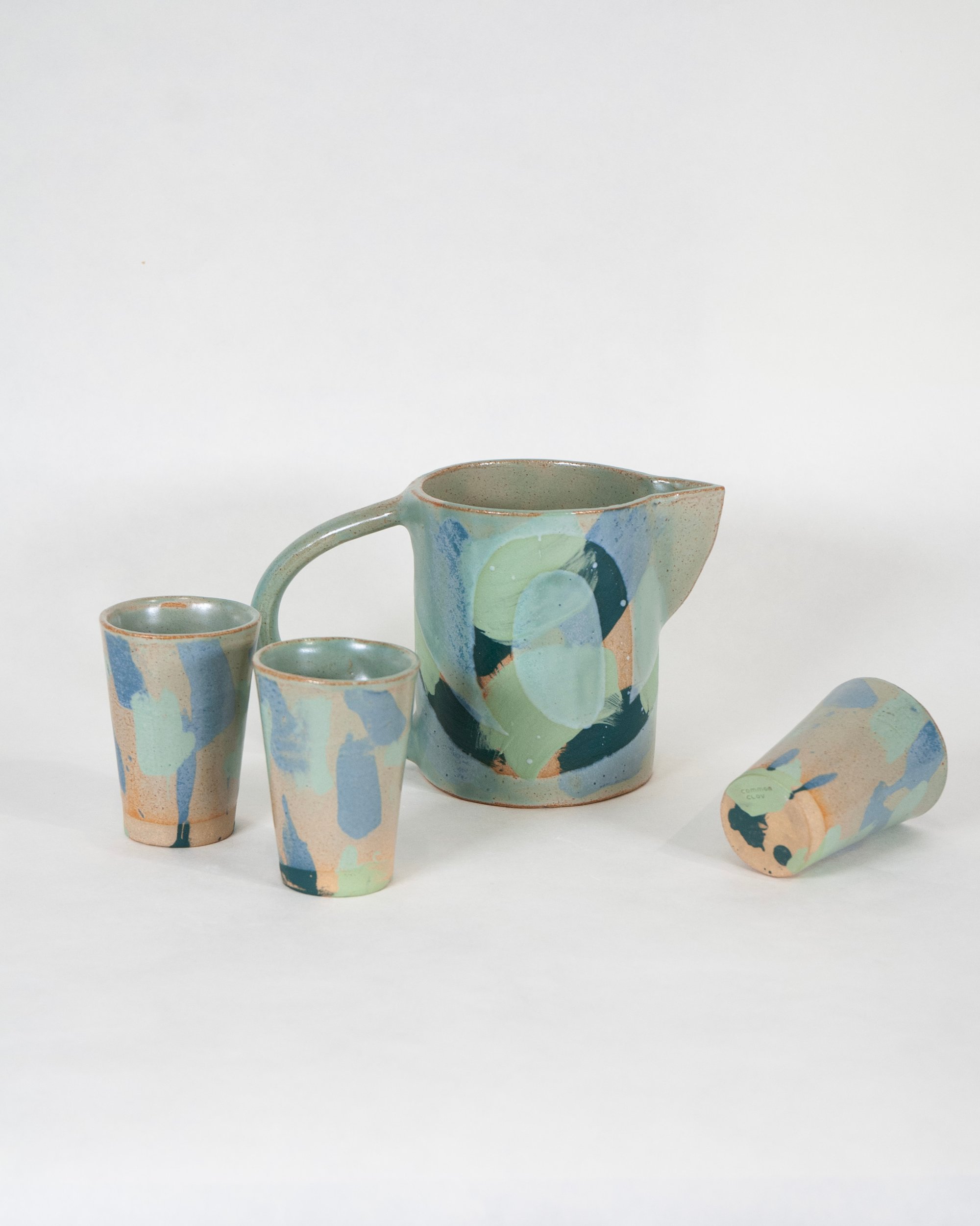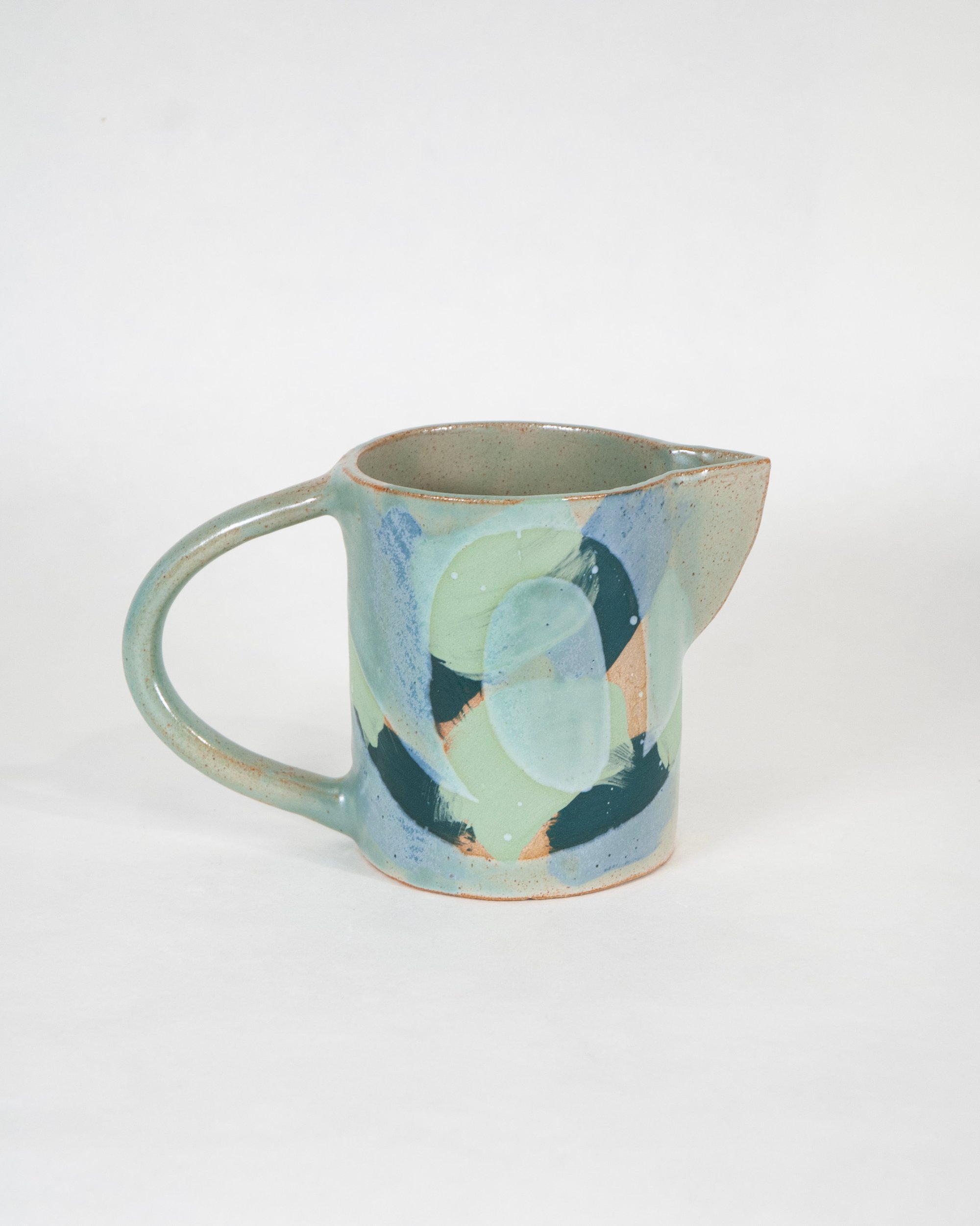 Ceramic stoneware jug with a green celadon glaze, colourful slips and wax resist design. Made by hand at the Common Clay studio in Bexhill-on-sea.