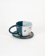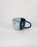 Ceramic stoneware cup with green glazes and wax resist design. Made by hand at the Common Clay studio in Bexhill-on-sea.