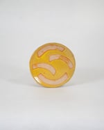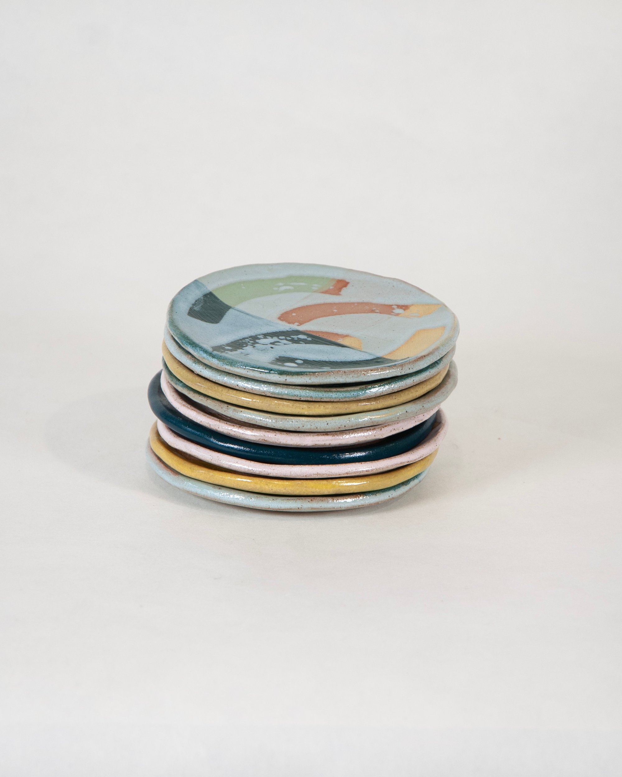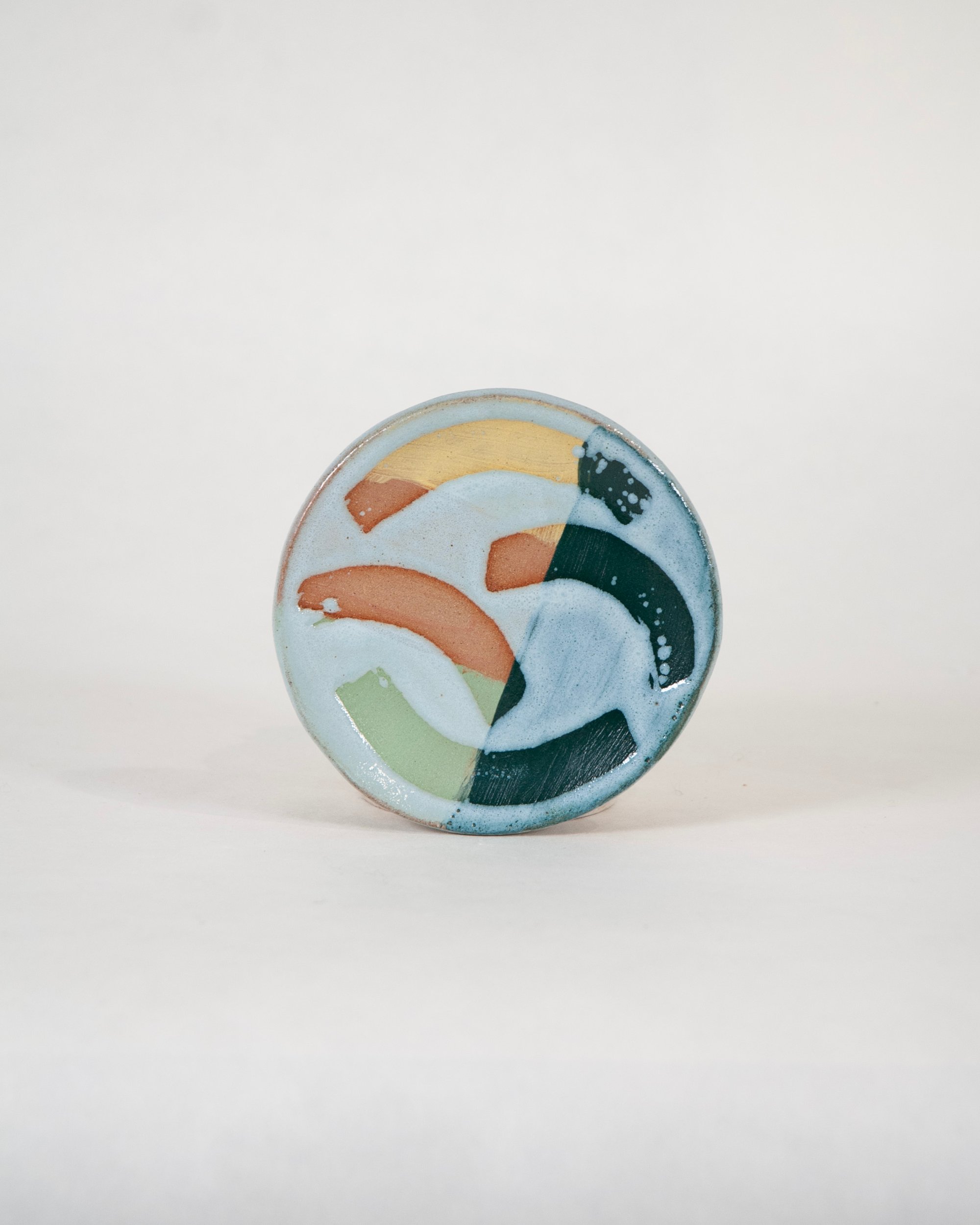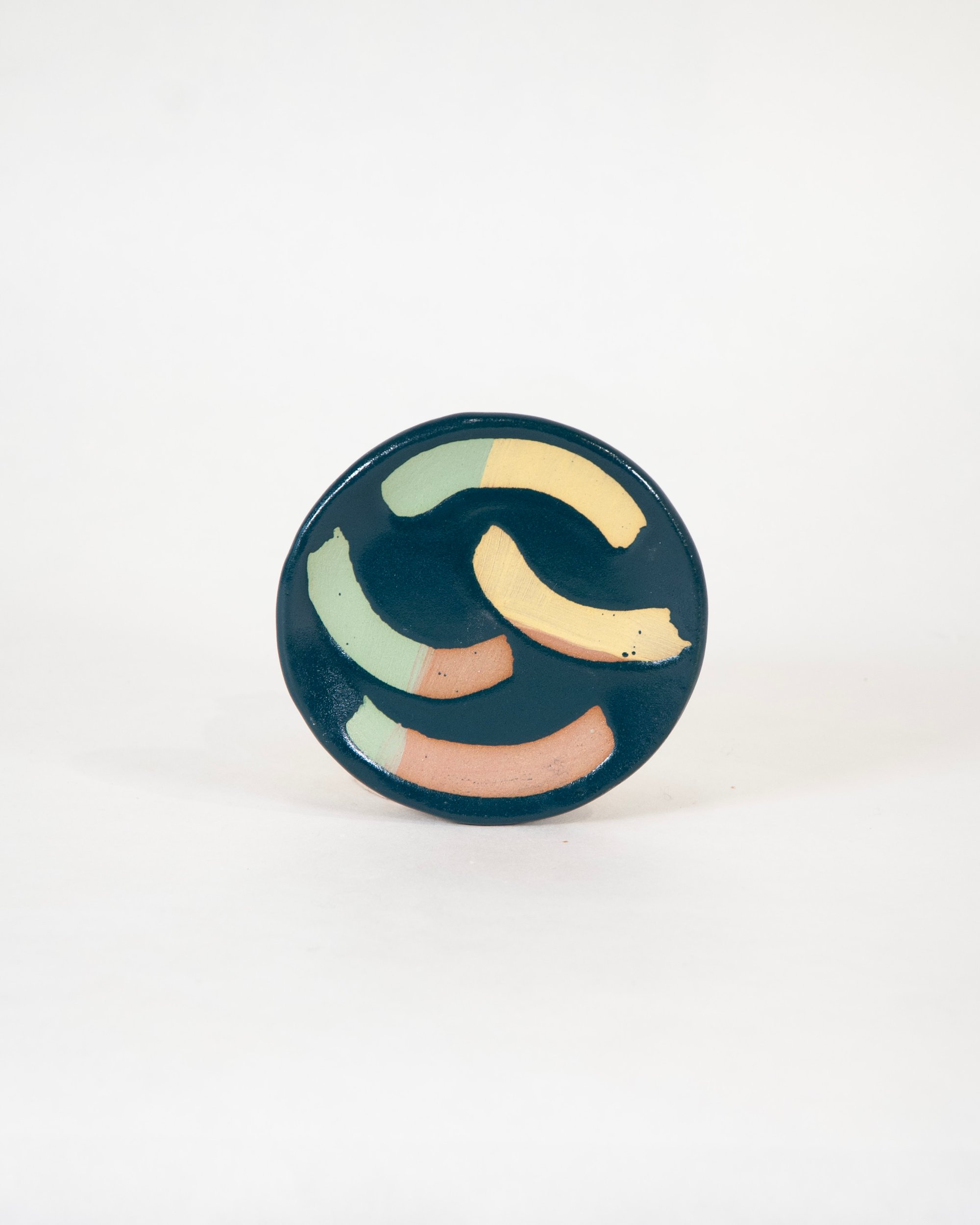Ceramic stoneware small dish/saucer with a colourful glazes, decorative slips and wax resist designs. Made by hand at the Common Clay studio in Bexhill-on-sea.