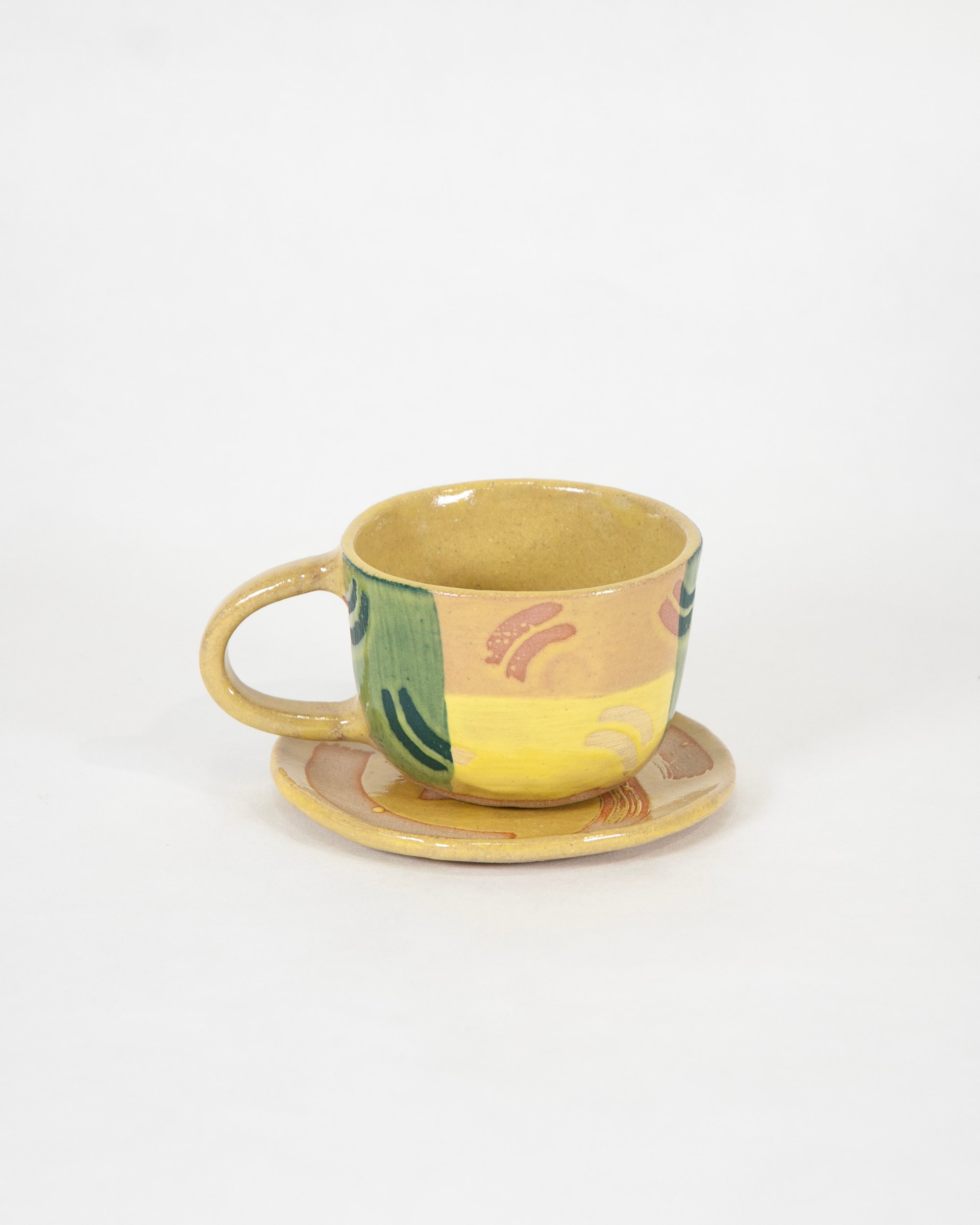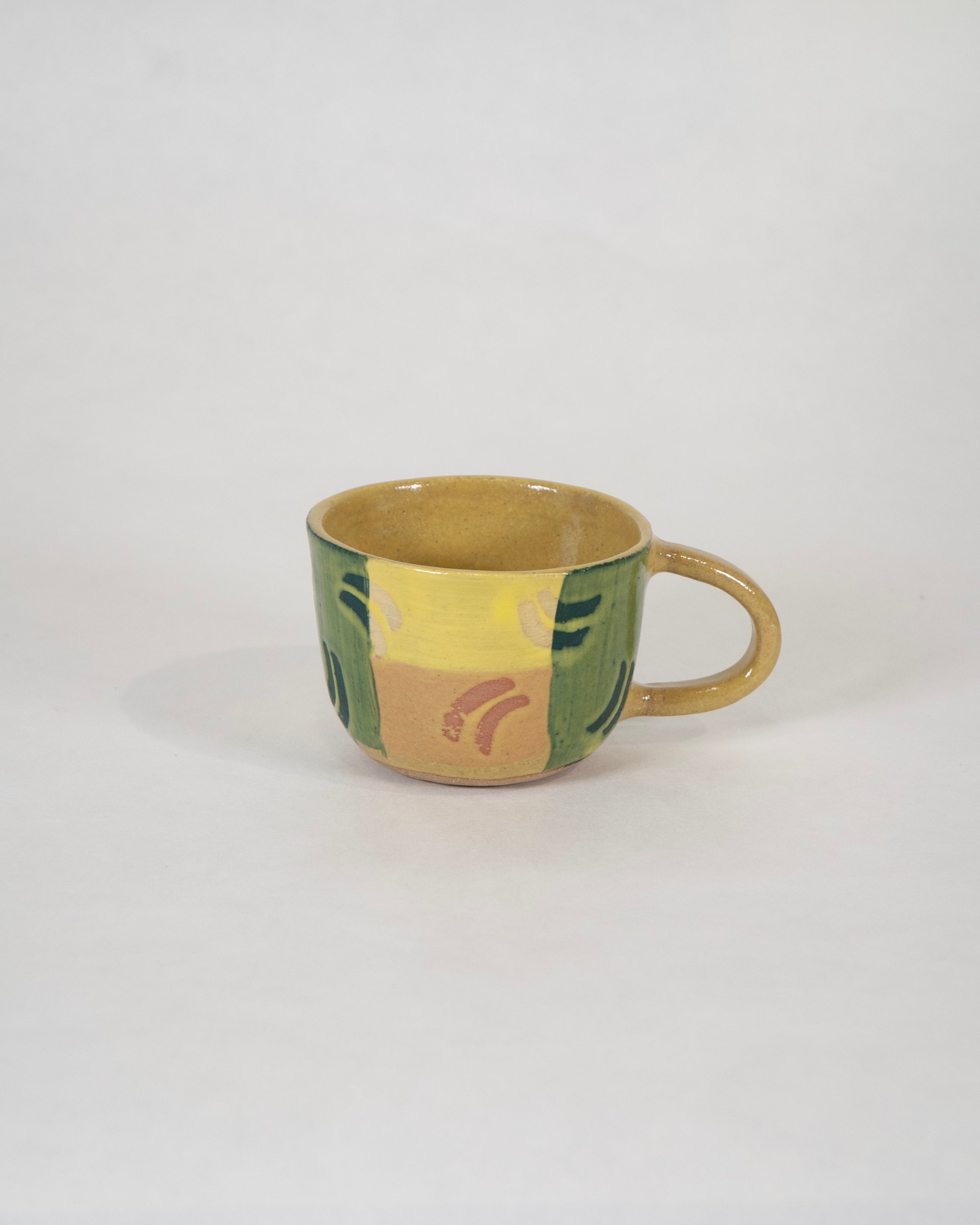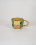 Ceramic stoneware cup with a yellow glaze, colourful slips and wax resist design. Made by hand at the Common Clay studio in Bexhill-on-sea.